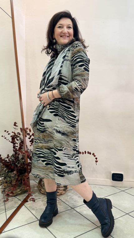 La stampa astratta nei toni della terra e del nero dona movimento e personalità, mentre il taglio svasato accarezza la silhouette con grazia.