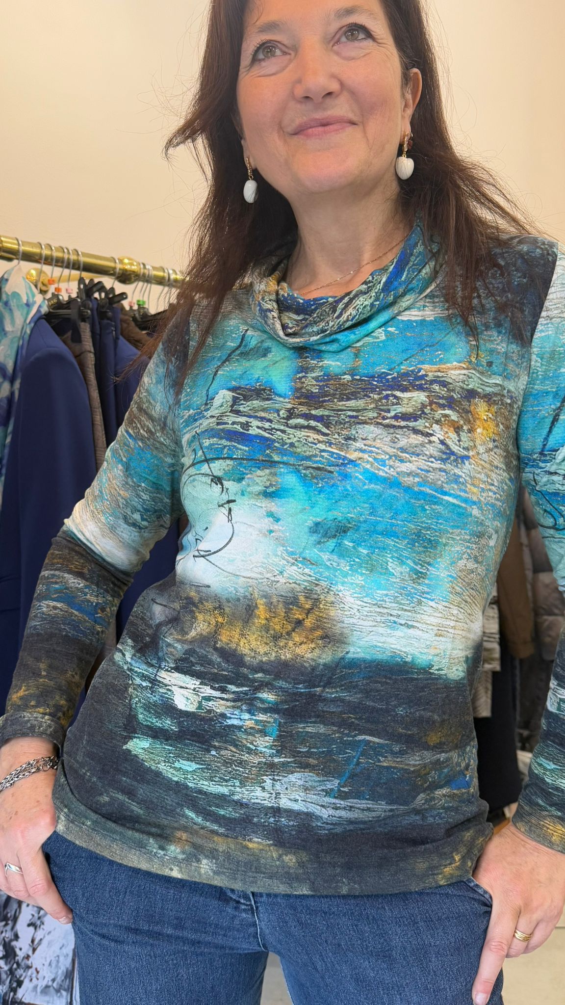 Maglia con particolare stampa originale ed unica, caratterizzata dal morbido collo alto a ciambella, perfetto per chi non ama i colli alti troppo avvolgenti.