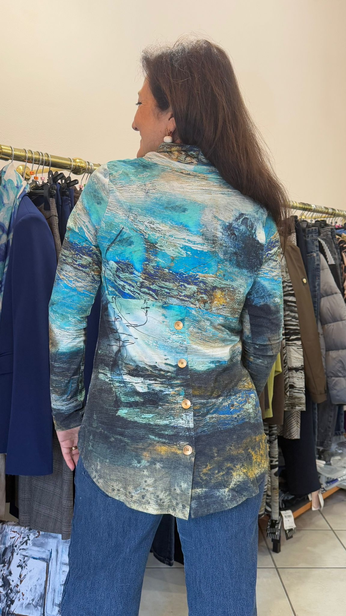 La manica a 3/4 ha il fondo con elastico che consente di avere l'effetto blusa. Può essere indossato anche aperto come spolverino.
